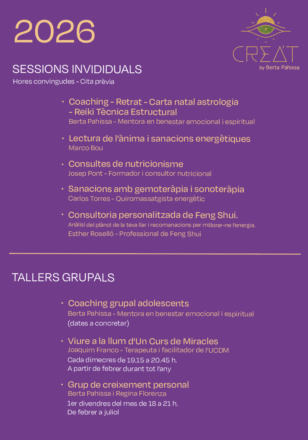 CREA’T és un espai de llum, un taller creatiu, un temple íntim holístic connectat amb la natura que neix de la fusió de tots els meus coneixements adquirits al llarg del meu camí. Una fusió entre diferents disciplines: físiques, emocionals i espirituals per acompanyar-te amb tot el meu amor en el teu singular procés d'autoconeixement. La seva missió és compartir, donar llum, sembrar, inspirar, aportar consciència, coneixement, transformació, evolució i floreixement. És un espai per crear, crear-te i recrear-te i esculpir