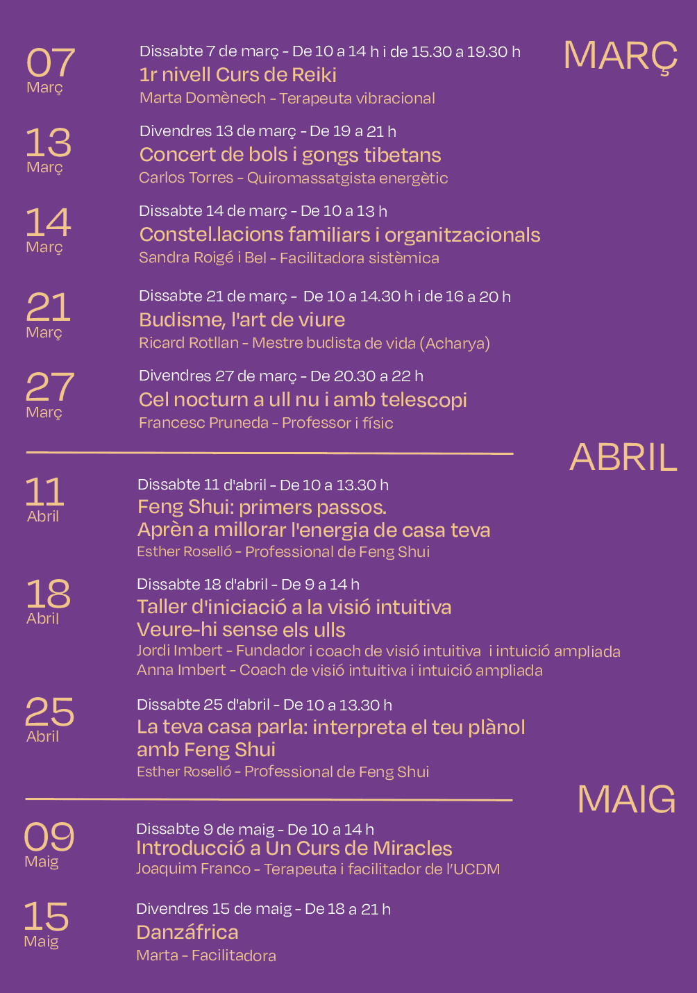 Un projecte on Coaching, Astrologia, Reiki, Art, Constel·lacions familiars, Numerologia, Canalitzacions, Meditacions, entre altres disciplines, uniran camins pel benestar de les persones. Em sento profundament agraïda per aquesta oportunitat i per poder compartir camí en aquest lloc tan especial.