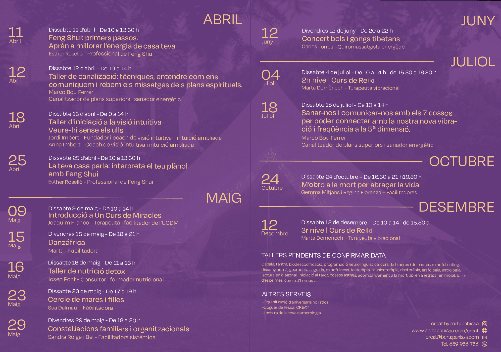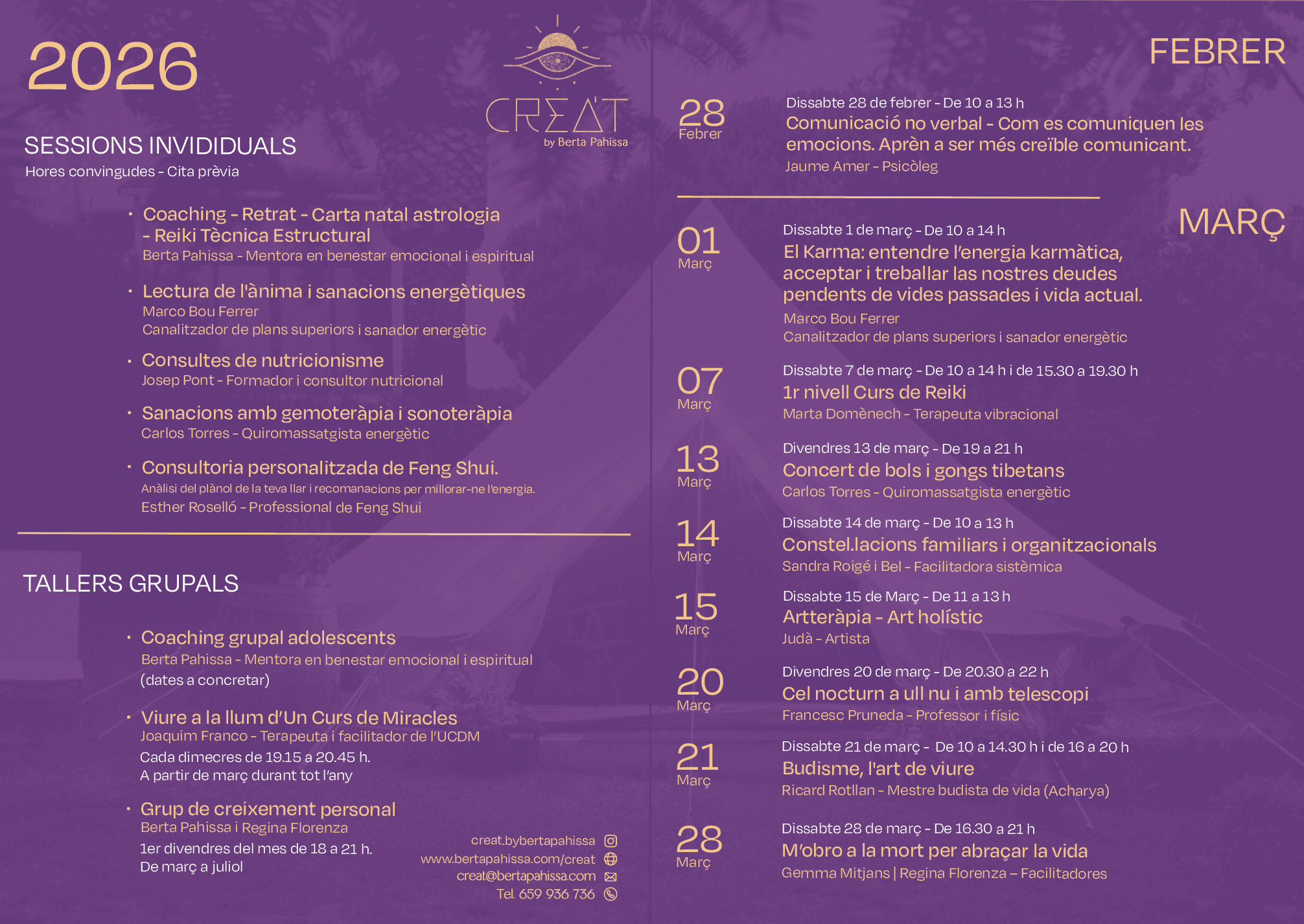 CREA’T és un espai de llum, un taller creatiu, un temple íntim holístic connectat amb la natura que neix de la fusió de tots els meus coneixements adquirits al llarg del meu camí. Una fusió entre diferents disciplines: físiques, emocionals i espirituals per acompanyar-te amb tot el meu amor en el teu singular procés d'autoconeixement. La seva missió és compartir, donar llum, sembrar, inspirar, aportar consciència, coneixement, transformació, evolució i floreixement. És un espai per crear, crear-te i recrear-te i esculpir